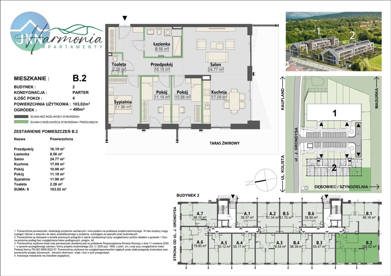 Oferowany lokal mieszkalny nr B.2 o pow. 103,02 mkw., z własnym ogródkiem o pow. ok. 450 mkw. oraz wystawą okien w kierunku południowo - zachodnim, zlokalizowany jest na parterze budynku nr 2.