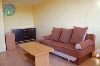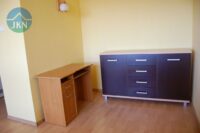 - pokój z wyjściem na balkon (podłoga: panele, ściany: malowane, rozkładana sofa, stolik kawowy, 2 x komoda, szafka, biurko)