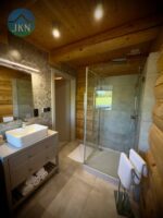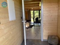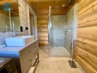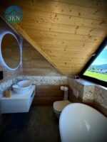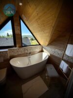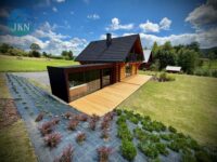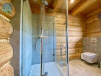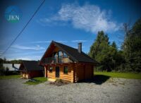Każdy z domów ma 92 m² oraz taras drewniany, a dodatkowo na działce znajduje się osobny domek SPA o powierzchni 18 m². Budynki wykonane zostały z wysokiej jakości bali świerkowych o wymiarach 32 × 28 cm, ręcznie ciosanych, co nadaje im niepowtarzalny charakter i trwałość. Dach pokryty jest blachą gontopodobną firmy Metrotile z posypką, a okna są trzyszybowe, plastikowe. Dojazd do posesji prowadzi drogą asfaltową, a ostatnie 80 m drogą utwardzoną.